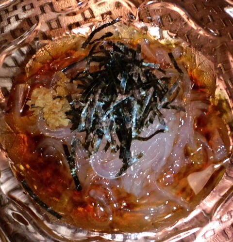 暦の上では夏を示す立夏を迎え、酒田市山居町の某居酒屋さんでは、早くも「ところてん」がメニューに載っていました。飛島のテングサを用いたもので、肌寒かった天候でしたが、ひとあし早く、これから迎える夏を感じることができました。ちなみに身が柔らかい夏イカ(酒田で水あげされたものではありませんが)も美味しかったです。オマケ…店内に飾ってありましたよ。(写真)