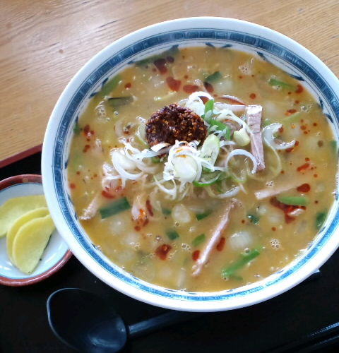 何にしようか考えた末、番組でも、ウドちゃんが辛そうに食べていた『耐寒ラーメンの味噌味』を頂きました。麺は中太縮れ麺で、ラー油がたっぷり入ったスープの中には大量の玉ねぎ・ニラ・挽き肉を炒めたものに細かく切ったチャーシューが入り、ネギと自家製の食べるラー油がのっています。辛さを覚悟していましたが、タマネギなど野菜の甘みが出てて、自分的には辛さは強くなく、初めて食べる味の美味しいラーメンでした。