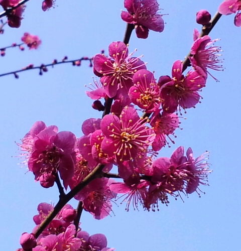 濃いピンク色をした紅梅が見頃を迎えていました。