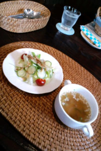 サラダと、スープが付いて、飲み物も数種類の中から選べるようです。