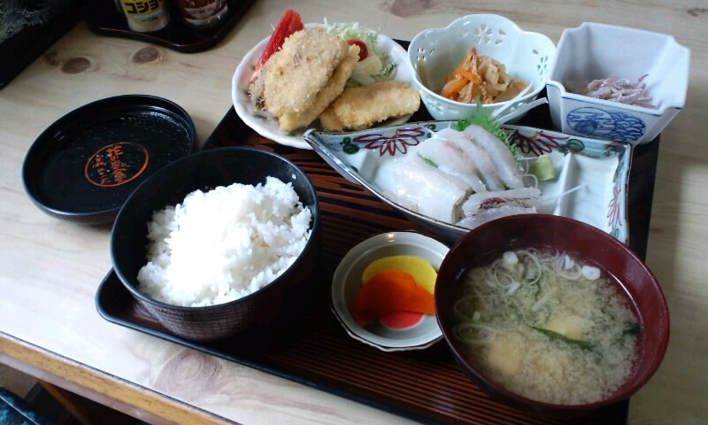 鳥しそフライ、魚フライ、刺身は(コチ・イカ・トビウオ)の3点盛りで、