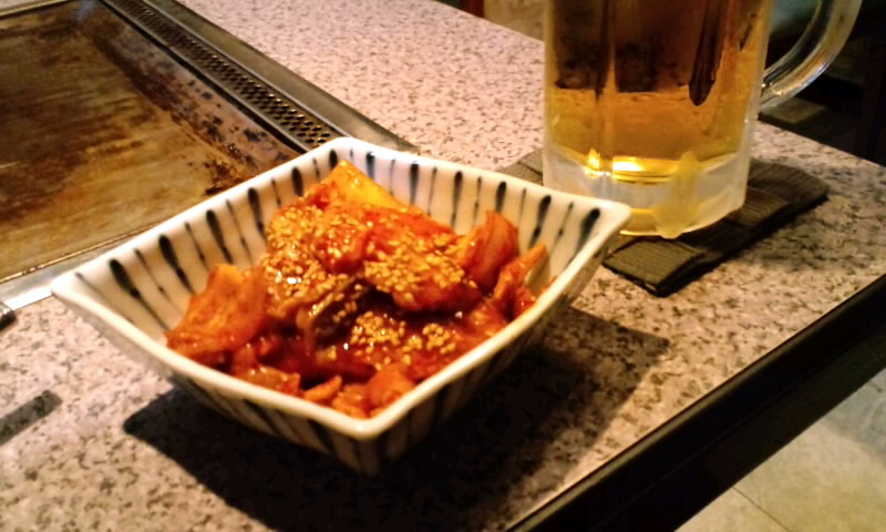 お好み焼きが来るまでの間、豚キムチをつまみながら生ビールを…。