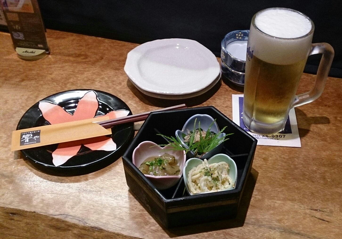 生ビールとともに運ばれてきたのは、可愛らしく盛られた3品の「お通し」です。