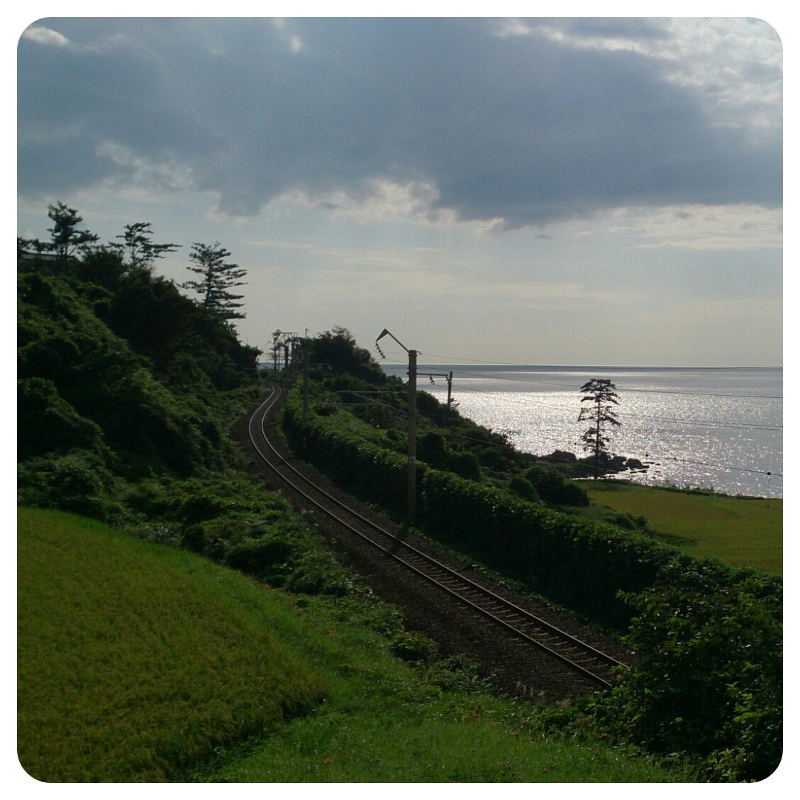 鳥崎踏切付近・・・日本海と、羽越本線と、田んぼが一緒に望めます。