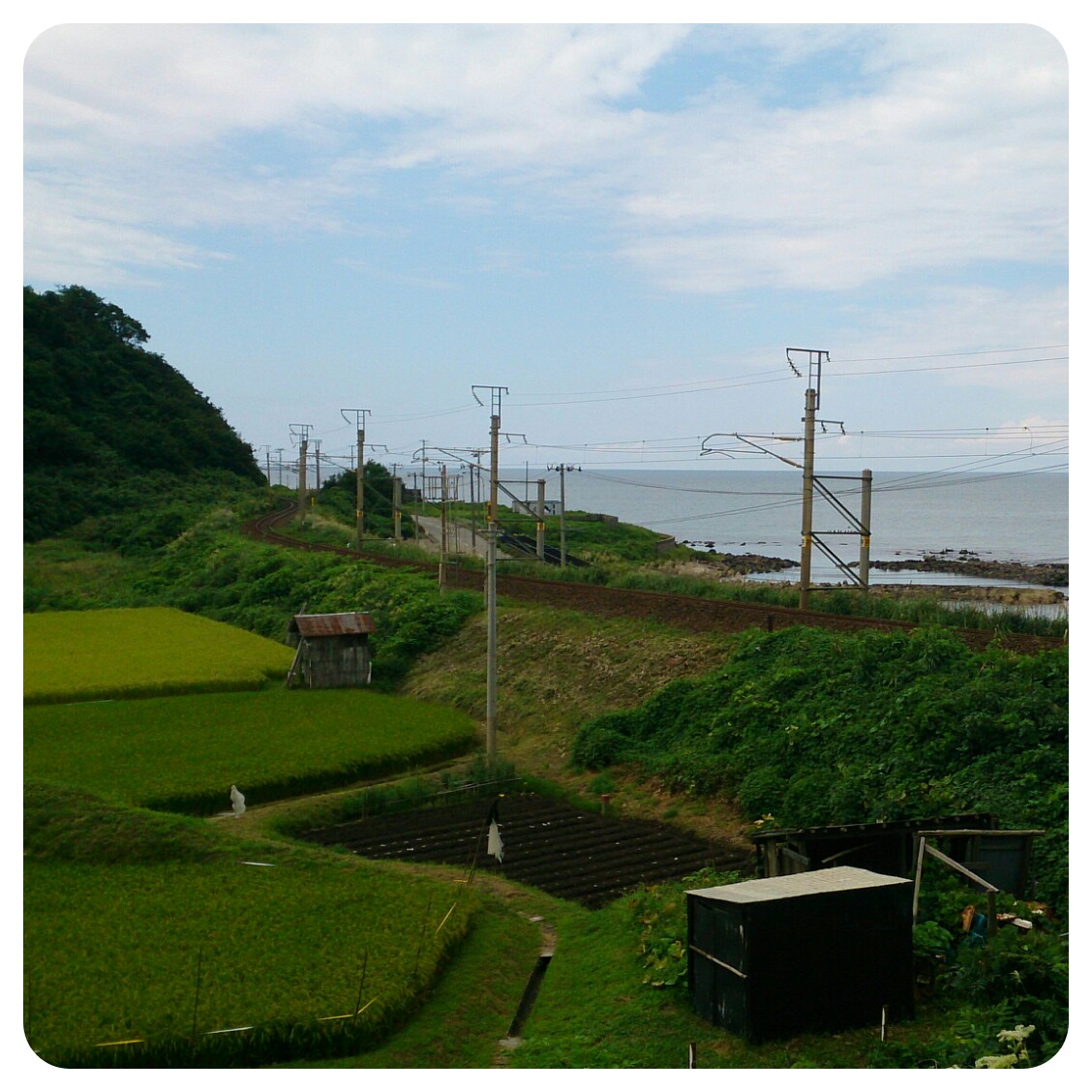 こちらからも、羽越本線の線路と田んぼとともに日本海が一望できます。