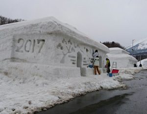 3月3日から5日まで開催されるのを前に、会場では雪像作品の溶けかかったり、