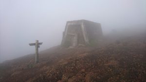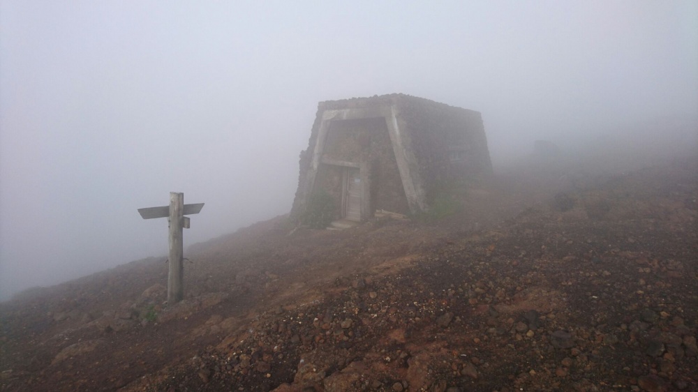 『馬の背』を経て、熊野十字路の近くにある『熊野岳避難小屋』の辺りも濃い霧が・・・。