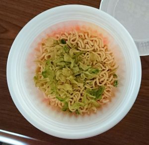 湯切りしたら、麺をほぐし、粉末スープをかけてかき混ぜて、出来上がりです!