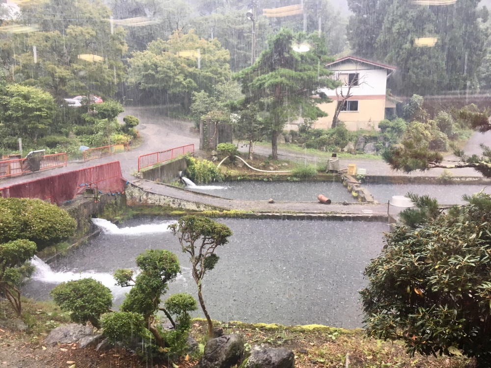 敷地内の生け簀では、たくさんのニジマスが養殖されています。