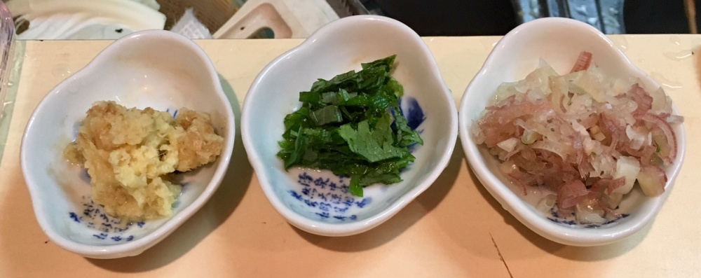 まずは、3種類の薬味(生姜・大葉・ミョウガ)の登場です。