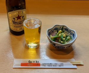 まずは、お通しとともに頂いた瓶ビール(サッポロの赤星)です。