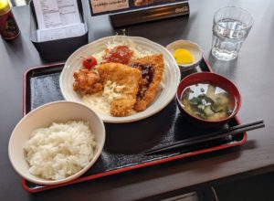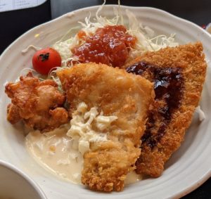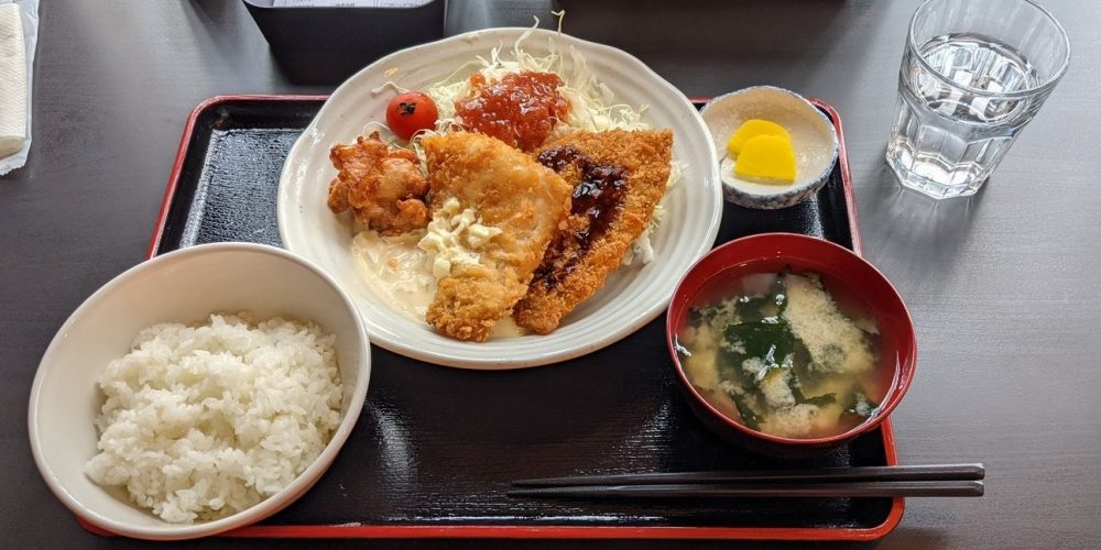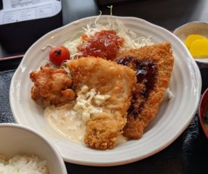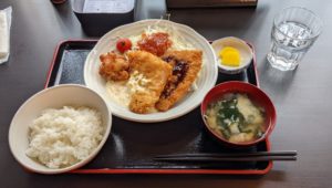 『ミックスフライ(鶏のから揚げ、白身魚フライ、アジフライ)定食』です。