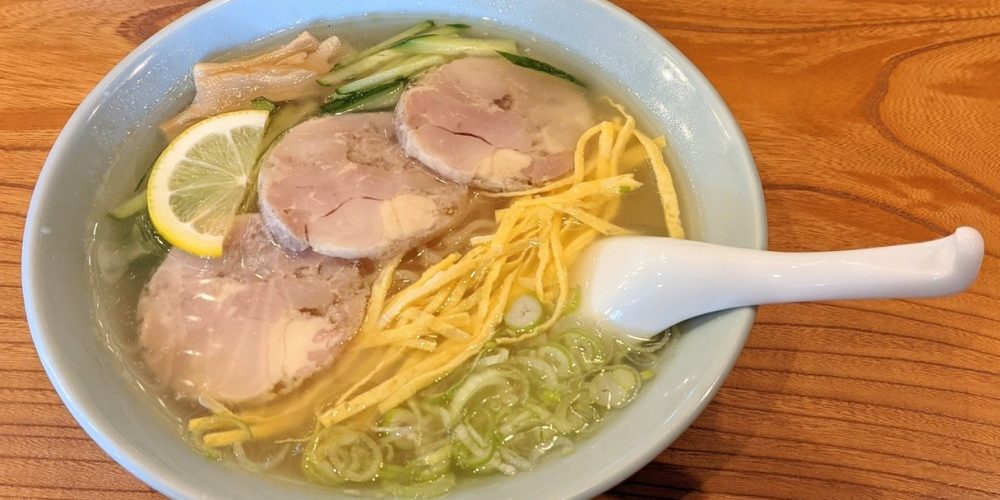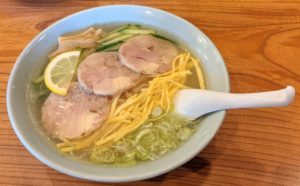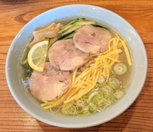 さっぱりとした塩味のスープに細麺と、チャーシューなどの具材・・・。