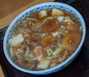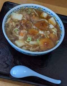 なめこの他、白菜などの野菜が入ったあんかけスープは熱々で、