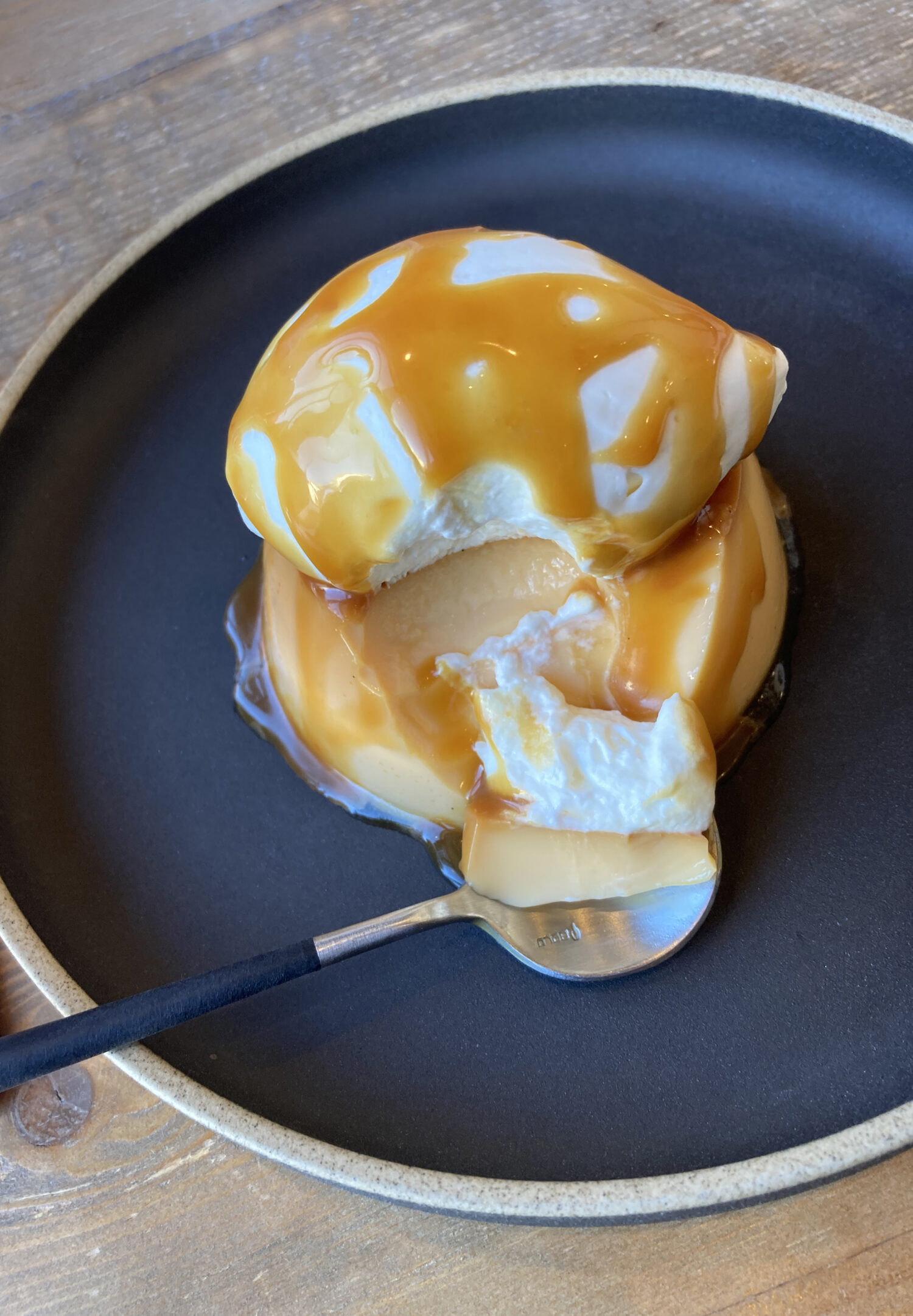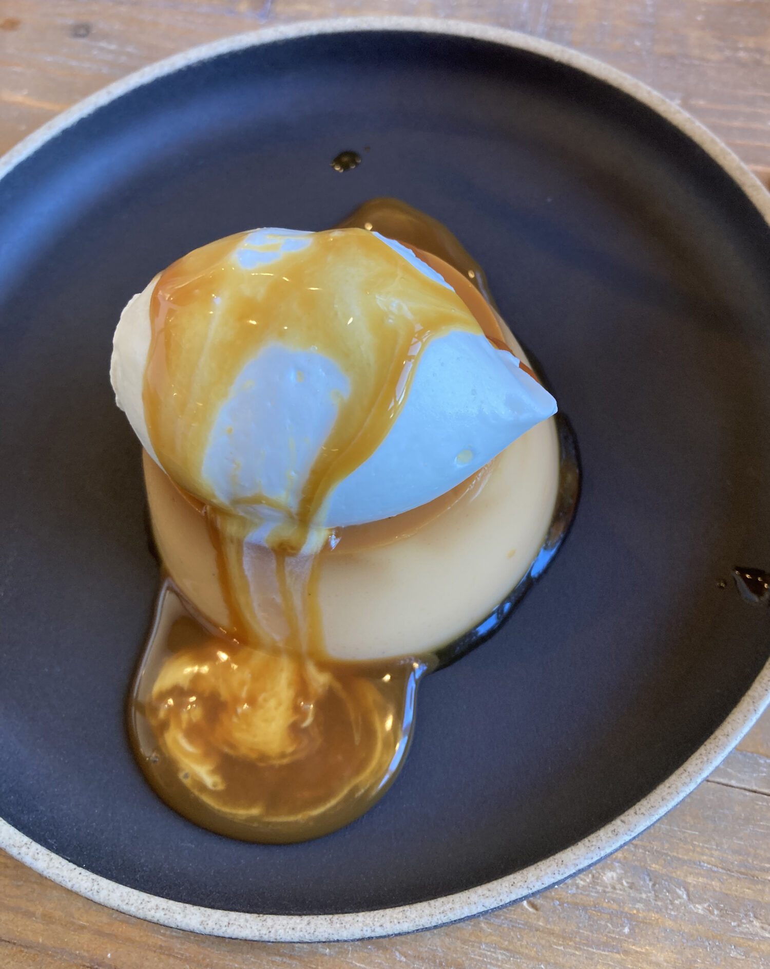 やってきました。アツアツの生キャラメルソースと冷たいプリン。