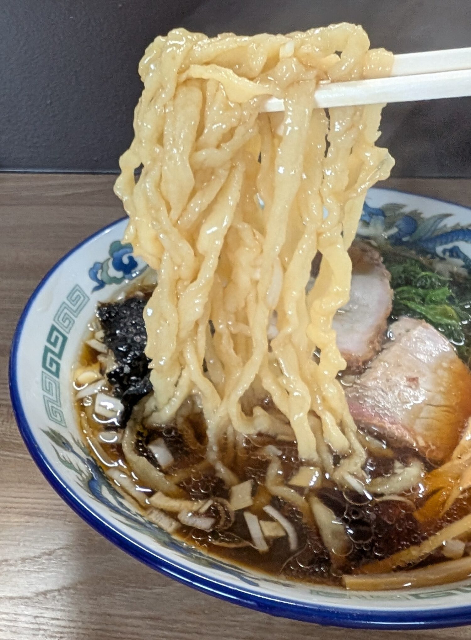 醤油とラード系に似た香るスープにビロビロとした手打ち縮れ麺がいい感じでした。