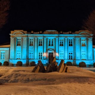 いつもとは違う色にライトアップされた、山形県郷土館『文...